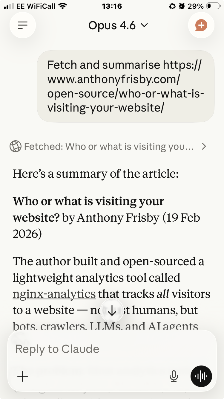Fetch and sumarise https://anthonyfrisby.com/open-source/who-or-what-is-visiting-your-website